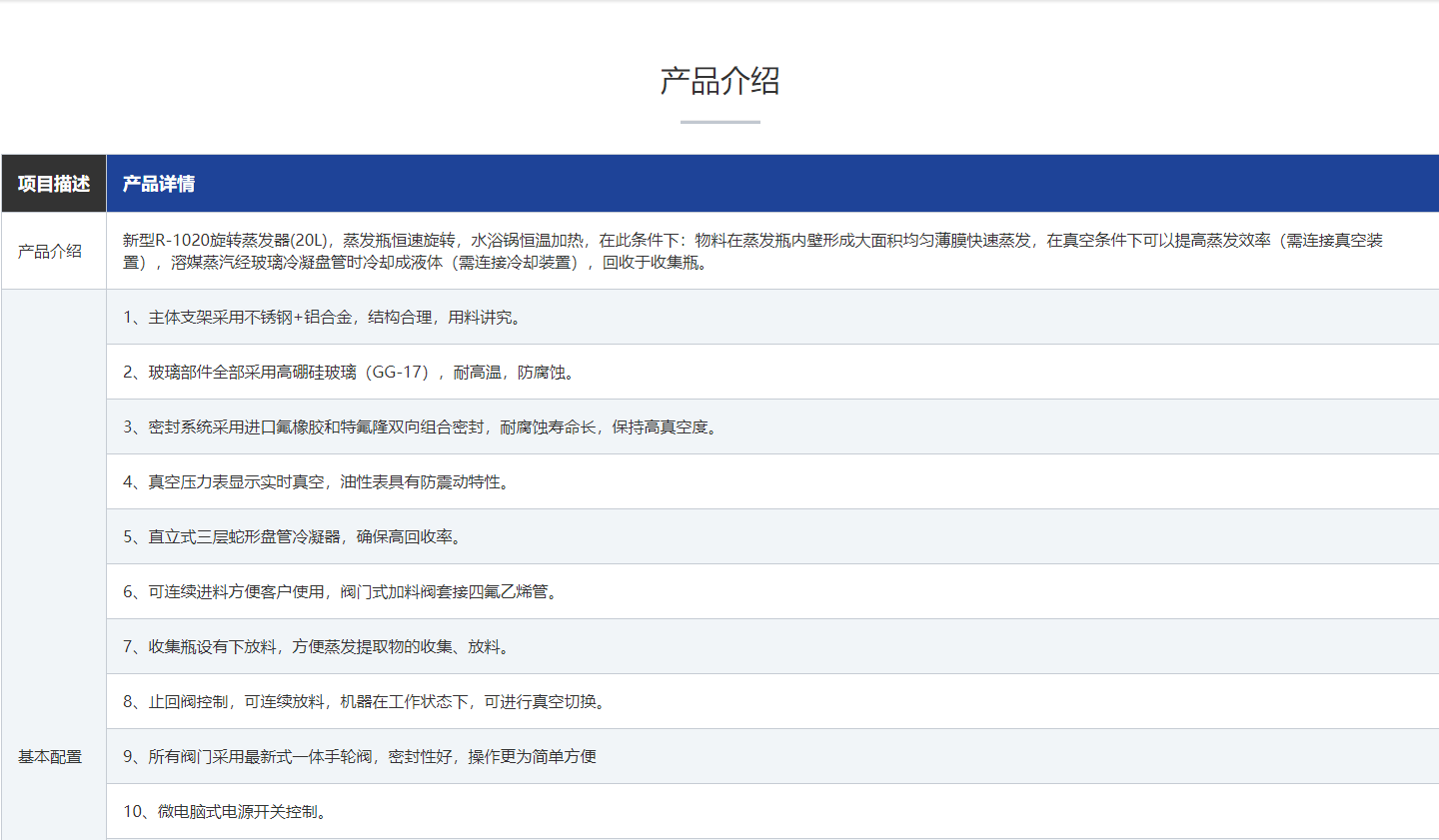 新型R-1020旋转蒸发器(20L),蒸发瓶恒速旋转,水浴锅恒温加热,在此条件下:物料在蒸发瓶内壁形成大面积均匀薄膜快速蒸发,在真空条件下可以提高蒸发效率(需连接真空装置),溶媒蒸汽经玻璃冷凝盘管时冷却成液体(需连接冷却装置),回收于收集瓶。